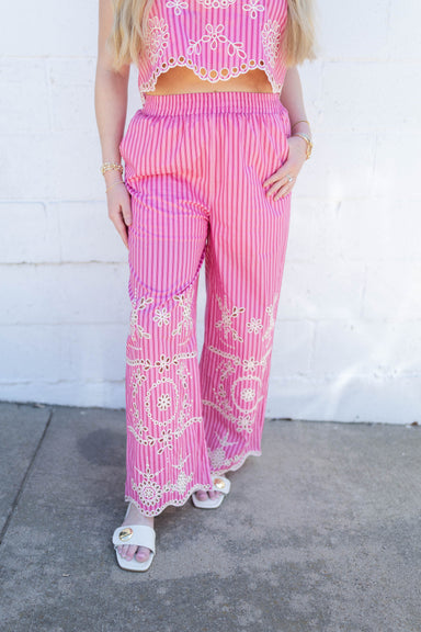 Add a pop of sweetness to your wardrobe with the Rosalie Stripe Pants. Featuring delightful light and dark pink stripes and charming white eyelet e...