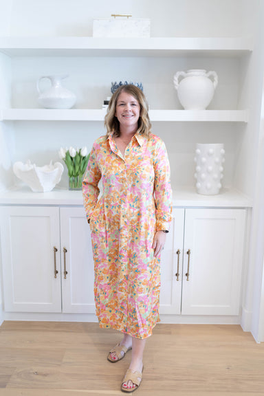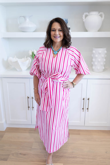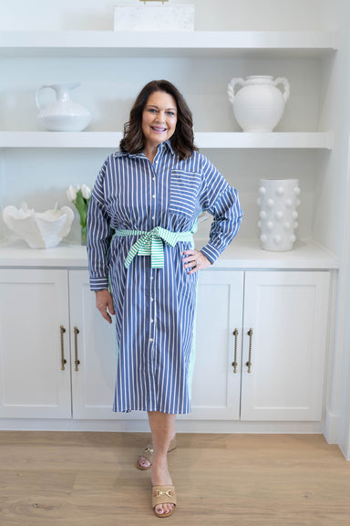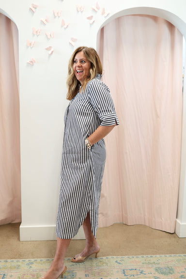 Meet the Ellie Midi Stripe Dress, a charming button-down piece featuring a stylish high collar. Perfect for any occasion, dress it up with heels fo...