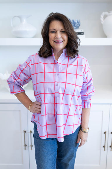 Add a cheerful touch to your wardrobe with the Proper In Pink Top! Its bright pink hue adds the perfect pop to any outfit, while the high collar an...