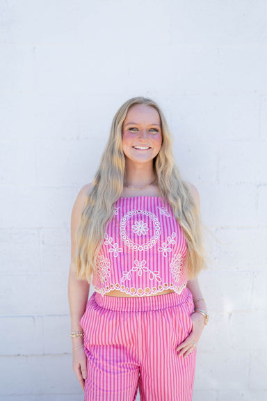 Meet the Rosalie Stripe Tank, a charming blend of light and dark pink stripes! This sleeveless, cropped design features delightful white eyelet emb...