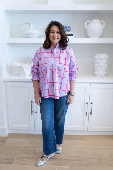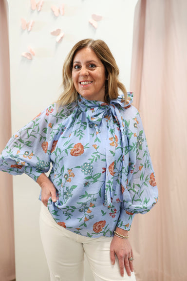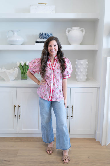 The Blue Blush Bloom Top features a charming floral design with little puffy sleeves and gingham trim. Perfect for sunny days, this button-down blo...