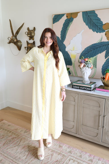 Embrace effortless summer style with this charming Sunny Midi Dress. Crafted in soft yellow gingham and breathable seersucker fabric, this flowy pi...