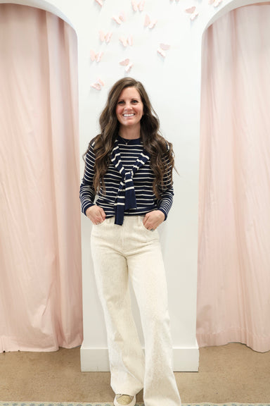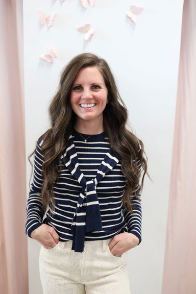 The Willa Top is your new go-to for effortless style. This lightweight striped sweater features a charming navy and white pattern that pairs with e...