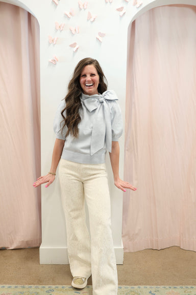 Adorable short sleeve sweater featuring delicate puffy sleeves and a charming tie bow neck detail. This light blue beauty brings a feminine touch t...
