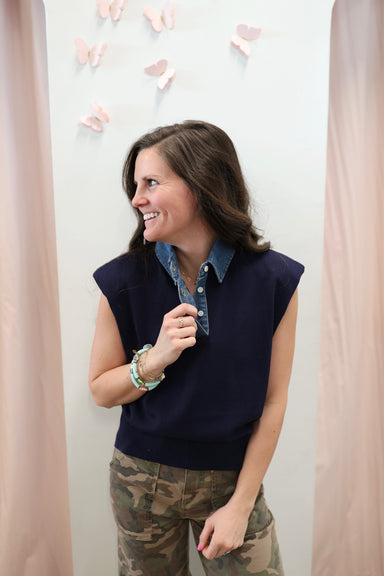 The Wren Sweater Tank is your new go-to layering essential. This sleeveless sweater features a charming denim color detail that adds visual interes...