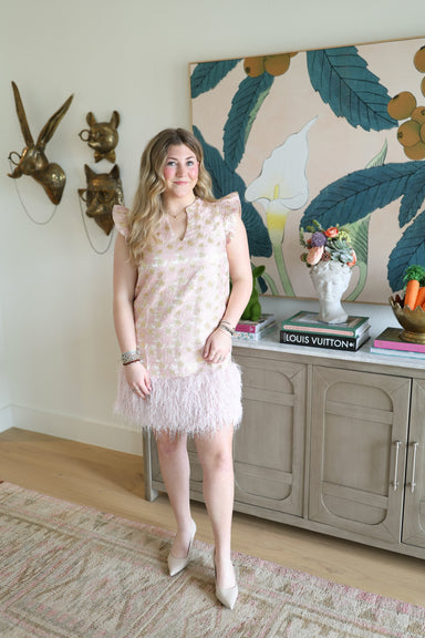 Make a statement in the Frannie Feather Dress, where elegance meets charm. This stunning piece features delicate light pink and gold floral shimmer...