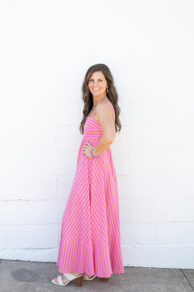 The Ellery Midi Dress combines timeless charm with everyday practicality. Featuring a cheerful green and white stripe pattern, this dress showcases...