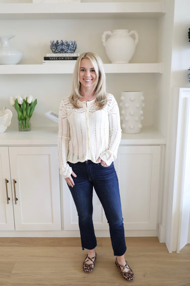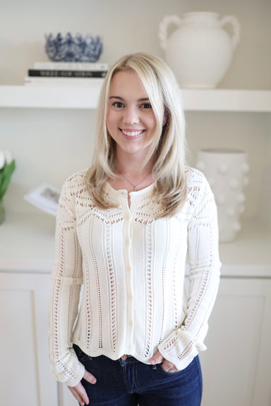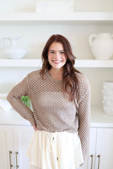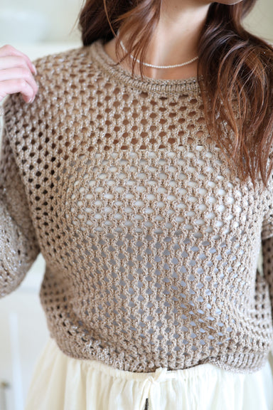 The Cala Shimmer Crochet Sweater adds a delightful touch to your outfit with its charming shimmer. Perfect for layering over a tank or your favorit...
