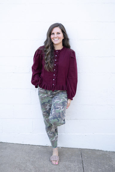 $172.00| /Our most-loved Worth Blouse returns! Effortlessly feminine with a flowy fit, ruffled neckline, ¾-length puff sleeves, and eye-catching contrast pip...