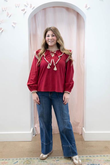 The Rachelle Geo Blouse is perfect for the holiday season with its shimmer sparkle detail. Dress it up for a Christmas party or dress it down with ...