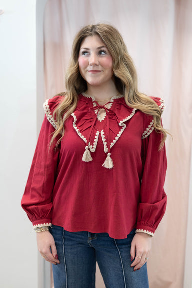 This blouse is your new go-to for effortless charm. Featuring a ruffle collar with scalloped detailing at the neckline, this top brings instant pe...