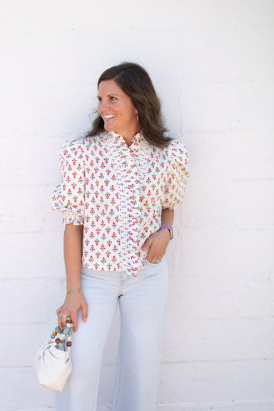 Our most-loved Worth Blouse returns! Effortlessly feminine with a flowy fit, ruffled neckline, ¾-length puff sleeves, and eye-catching contrast pip...