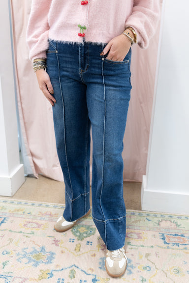 Holly straight leg jean in midtown wash, featuring a high rise design and a wide leg band for a sleek look. The tailored silhouette with patch pock...