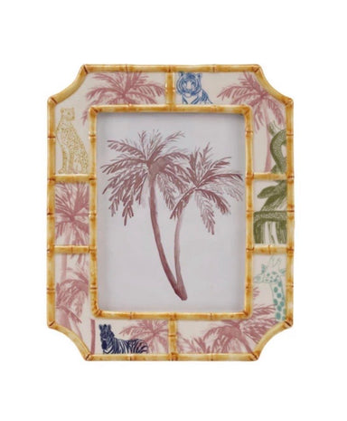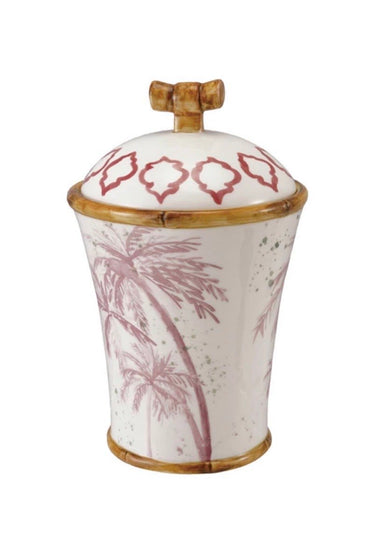 5-1/2" Round x 8-1/2"H Hand-Painted Stoneware Canister w/ Palm Trees & Bamboo Style Edges Use for makeup brushes, set on kitchen counter or st...