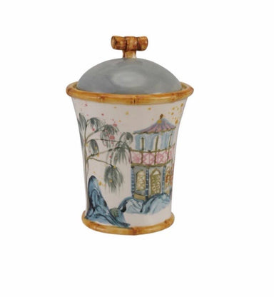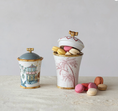5" Round x 7"H Hand-Painted Stoneware Canister w/ House, Palm Tree & Bamboo Style Edges Use for makeup brushes, set on kitchen counter or sty...