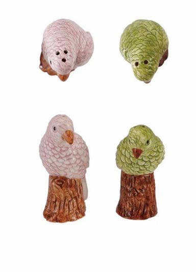Hand-Painted Stoneware Parrot Shaped Salt & Pepper Shakers, Green, Pink & Brown Set of 2