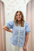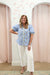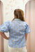 The Blue Blush Bloom Top features a charming floral design with little puffy sleeves and gingham trim. Perfect for sunny days, this button-down blouse adds a delightful touch to light-colored jeans for a fresh, cheerful look. Get ready to bloom with style!