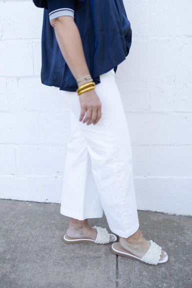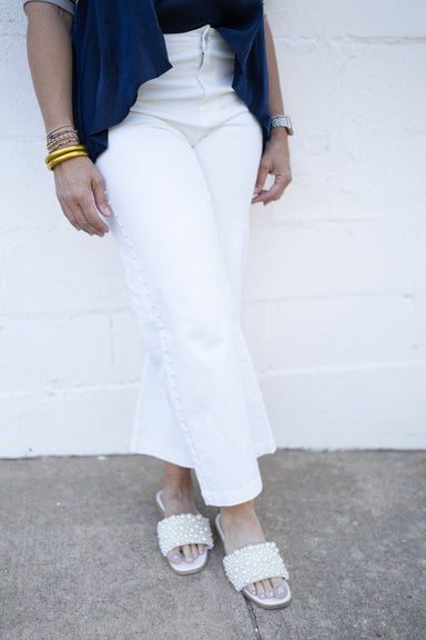 These White Pearl Jeans feature delicate pearl embellishments down the sides. Dress up or dress down! Model is wearing a medium and small Fabric Co...