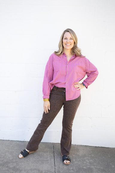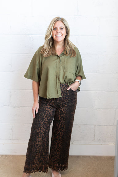 Adorable leopard ruffle button top that's endlessly versatile. Pair with jeans for casual charm or a skirt for something sweeter. Dress it up or do...