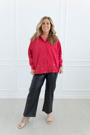 The Rachelle Geo Blouse is perfect for the holiday season with its shimmer sparkle detail. Dress it up for a Christmas party or dress it down with ...