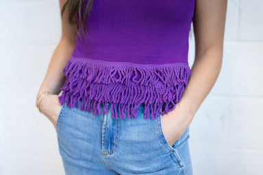 Elevate your TCU game day look with our Jade Blouse. Featuring fringe detail and a stylish sweater tank design, this blouse is perfect for showing ...