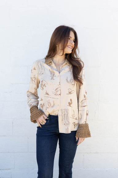This charming Cheyenne Western Cuff Top pairs a fun rodeo print with delicate ruffle cuffs for an irresistibly cute western look. Perfect for addin...