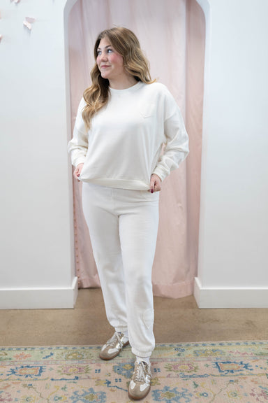 This soft fleece jogger is designed with tonal heart appliqués and a relaxed, tapered fit that’s flattering and comfy. The drawstring waistband an...